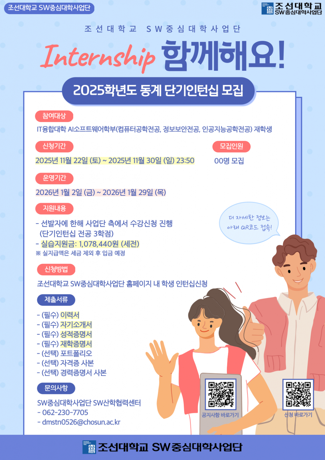 - 해당 인턴십 선발 시 2025학년도 동계 계절학기 교과목인 단기인턴십(3학점) 이수