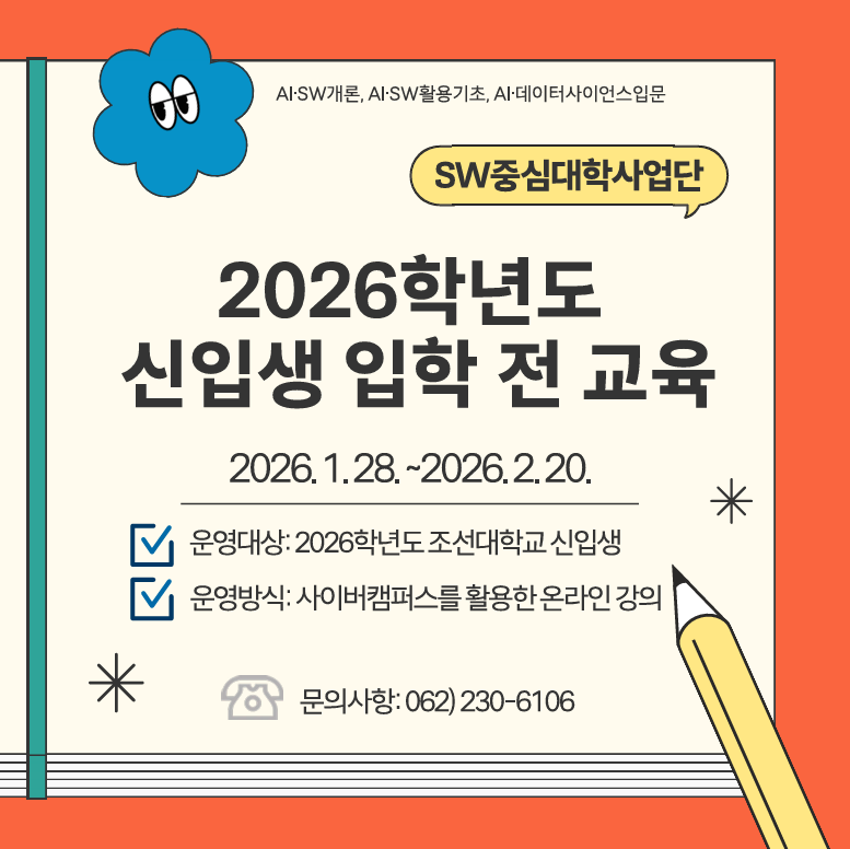 조선대학교 SW중심대학에서는 예비 조선인들의 SW학업 역량에 대한 이해도를 높여 대학 생활의 빠른 적응을 지원하고자 입학 전 교육을 마련하였으니 많은 참여 바랍니다.