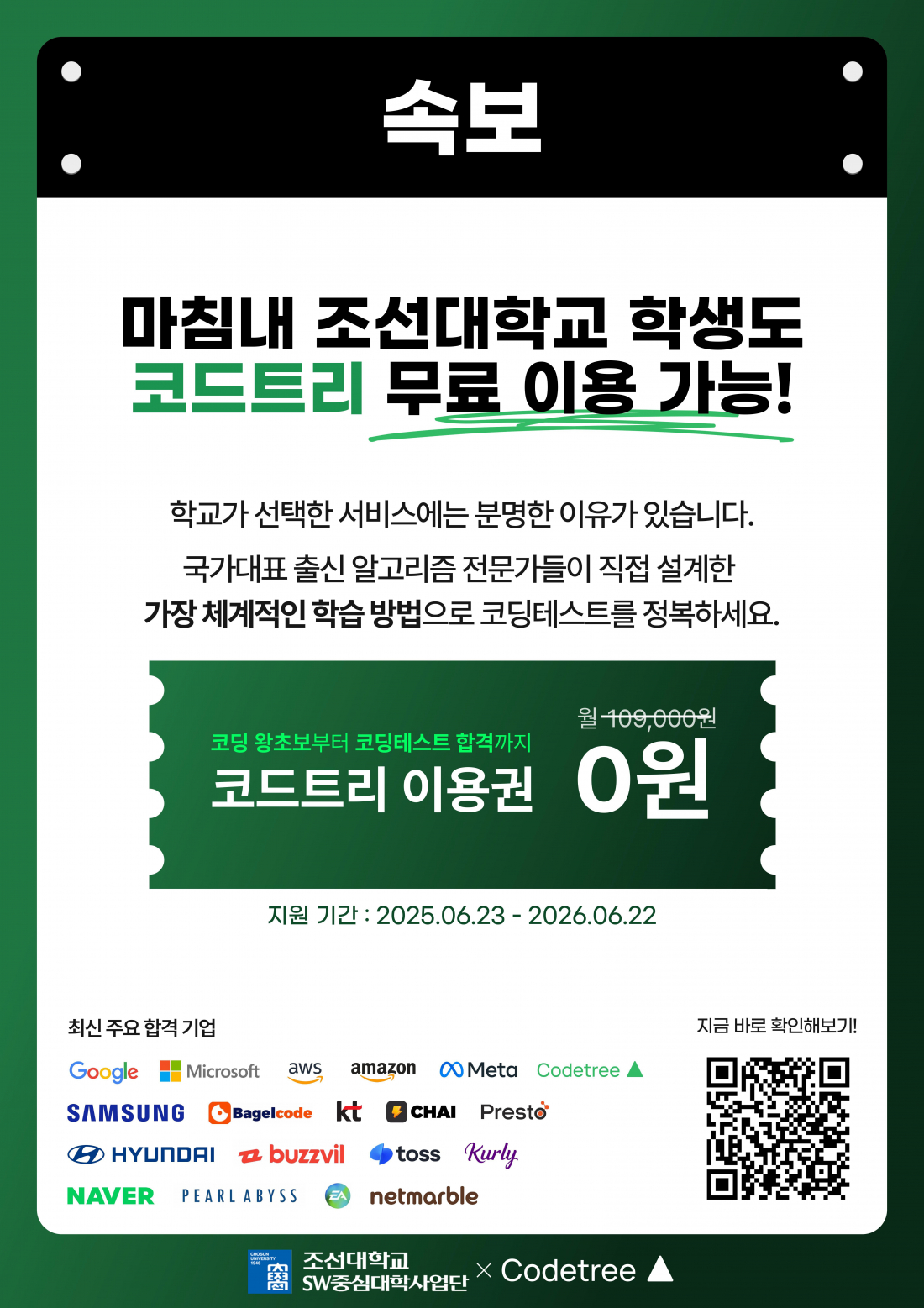 조선대학교 SW중심대학사업단에서는 재학생들의 SW 역량 강화 및 코딩 테스트 대비 학습 지원을 위해 온라인 코딩 학습 플랫폼 「코드트리(Codetree)」를 무료로 제공합니다.