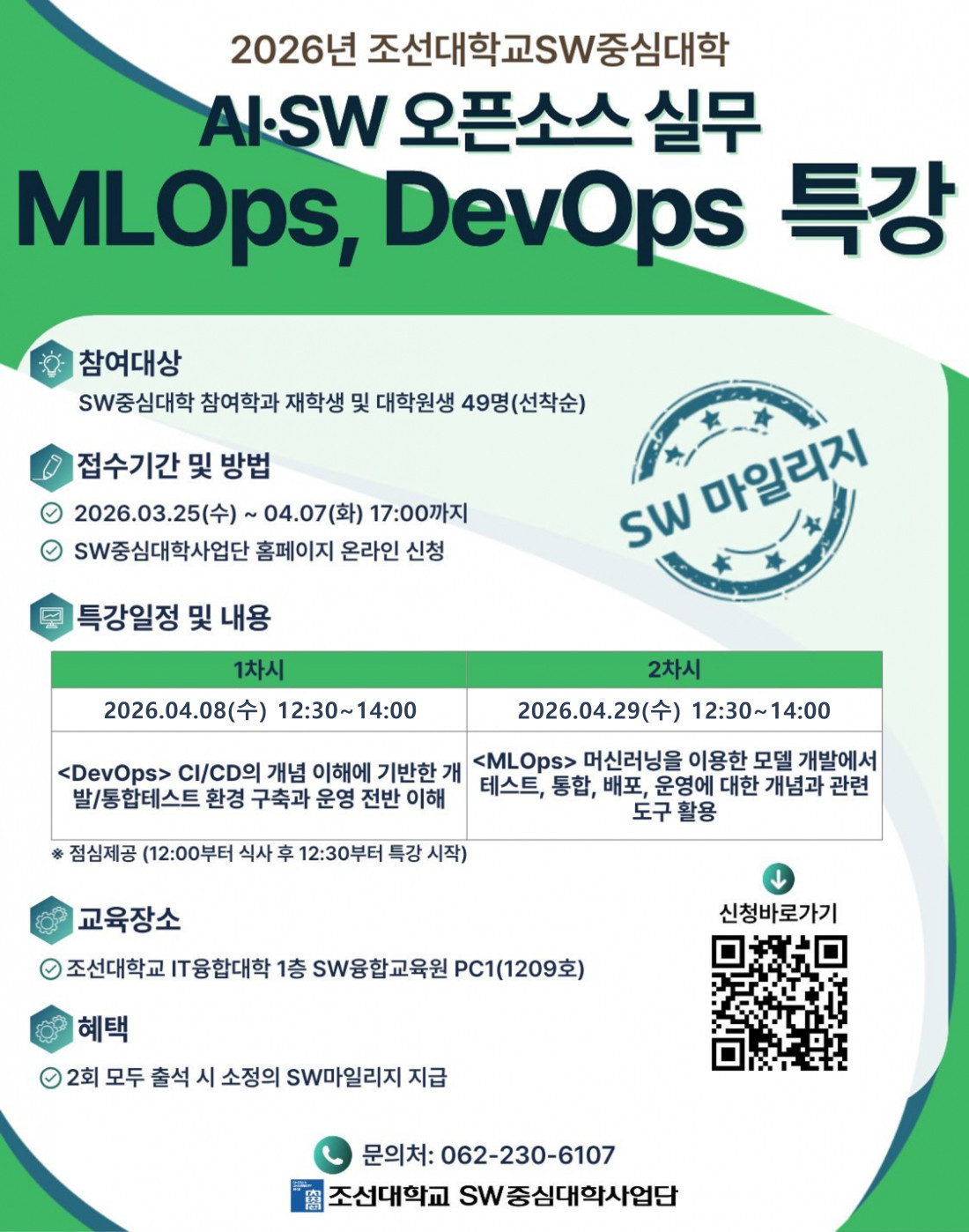 * SW중심대학사업단 홈페이지 > 온라인신청 > 지원프로그램 > 교육 > AI·SW 오픈소스 실무 (MLOps, DevOps) 특강